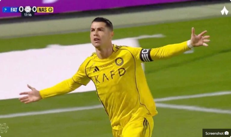 A historic scene that only happens with Cristiano Ronaldo: the moment he scored a goal in the Al-Fateh vs. Al-Nasr match.