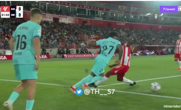 The Almeria player came with all speed and pressed with all his strength in order to steal the ball from Yamal, but Lamine decided to surprise and deceive everyone with an amazing skill on the line that made the defender leave the field in a world-class way that caused an eart.hquake and made the fans explode in the stands and create a legendary fan epic because of what happened.